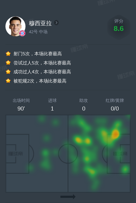 不仅在进攻端,穆西亚拉在比赛中的防守表现也值得肯定。他在地面争抢中有7次成功,同时还有1次抢断和1次成功的争顶,展现了全方位的能力。此外,虽然被犯规2次,但穆西亚拉也展现出了很高的抗压能力,成功创造多次进球机会。